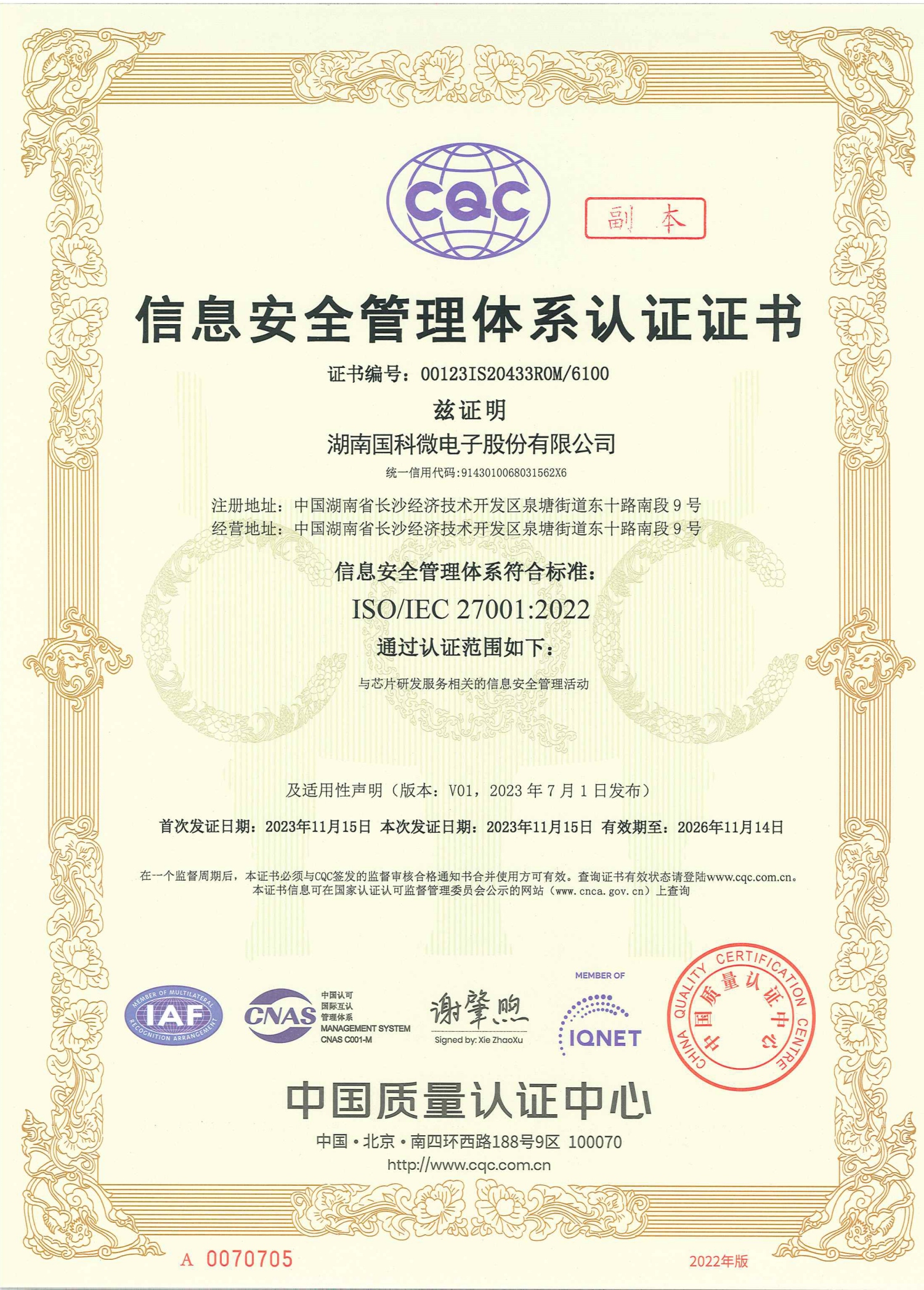 信息安全管理體系認(rèn)證證書